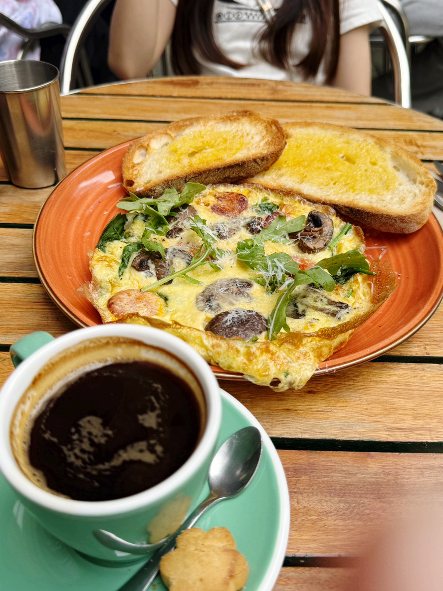 한국에서 1인 1 메뉴가 익숙해서 항상 음식 2개씩 주문하다가 매번 남기다 보니, 이번에는 커피 1, 음식 1을 주문했습니다. 딸아이가 고른 "The Omelette" 버섯을 좋아하는 딸이지만, 버섯이 너무 버섯!!!!!!입니다. ㅎㅎ 조금 남기고 나왔습니다.