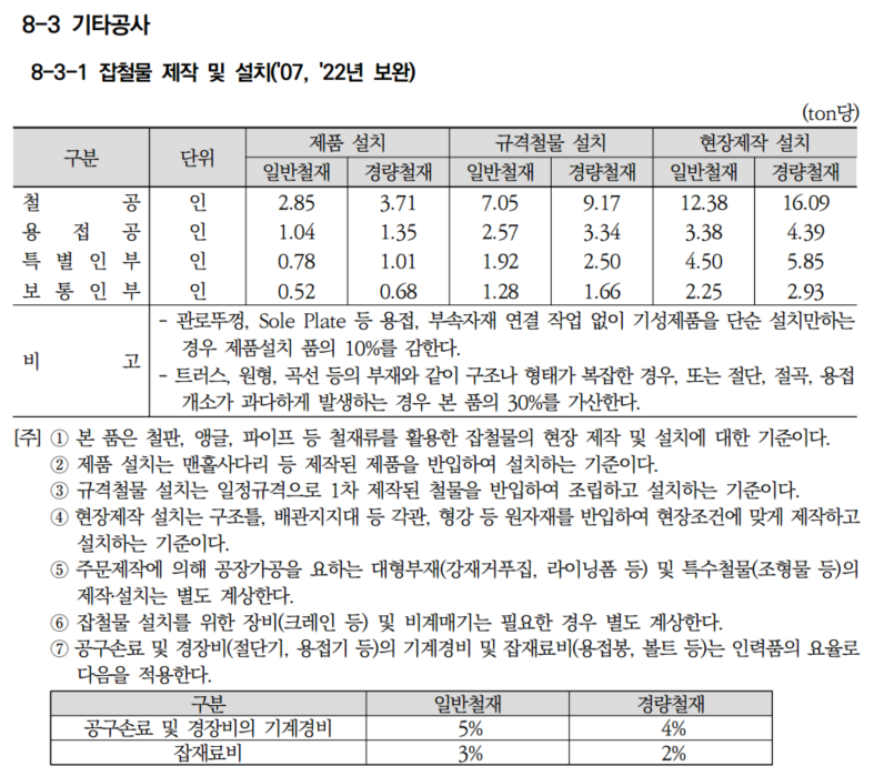 위 품셈에서 나와있는 현장제작설치 일반철재 기준을 적용하여 1 TON의 잡철물제작 및 설치, 현장제작설치하는데 소요되는 노무비가 산출됩니다. 주기사항 7번에 나와 있듯이 기계경비는 일반철재의 경우 노무비의 5%를 적용하고, 잡재료비는 노무비의 3%를 적용하여 반영해 줍니다.