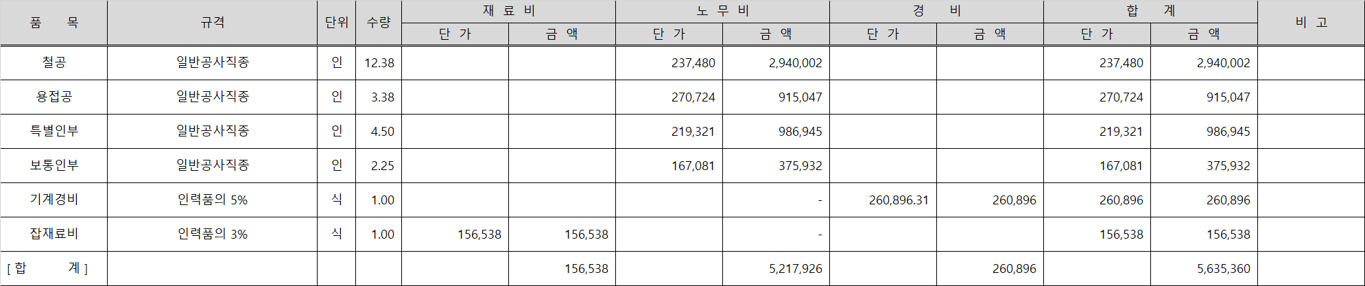 잡철물제작 및 설치 일위대가