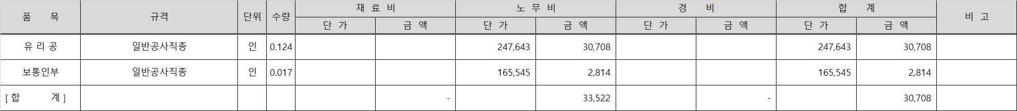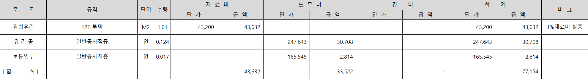 위 건설공사 품셈에 기계경비나 잡재료비 같은 주기사항이 표시되어 있지 않아 재료비와 노무비만 반영으로 강화유리 일위대가 표가 작성됩니다.