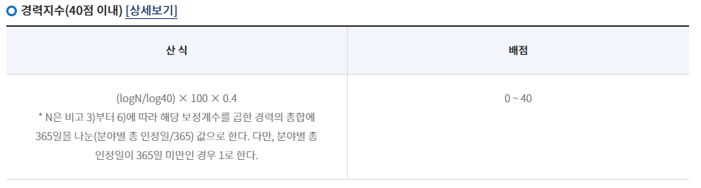 아래 사이트의 [상세 보기]를 눌러보면 각 경력신고기간별 쌓이는 경력지수가 표기되어 있습니다.