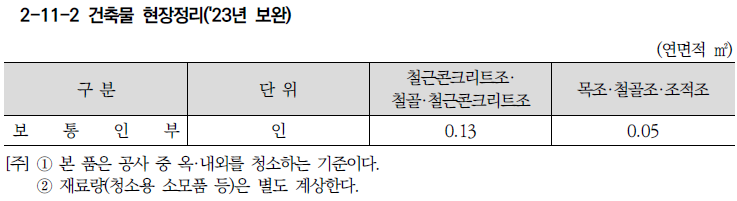 주기에 나와있다시피 공사 중 옥, 내외를 청소하는 기준입니다. 2022년도까지만 해도 건축물 현장정리에 준공청소를 포함하고 있었으나, 2023년도 품셈이 보완되면서 건축물 현장정리와 준공청소가 별도의 일위대가로 각각 반영할 수 있게 되었습니다.