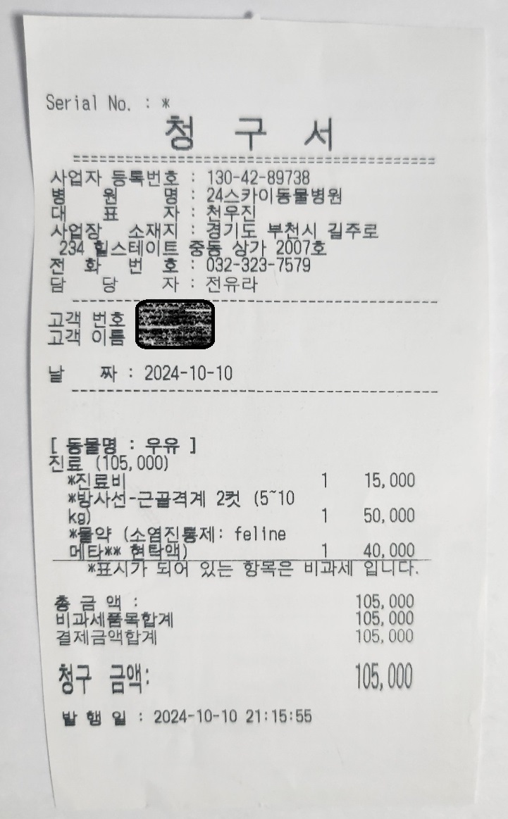평일과 공휴일 진료비 상이하며, 야간과 심야로 진료비가 다르게 책정되어 있습니다. 우유의 경우 엑스레이 +소염진통제 처방받고 105,000원 병원비가 나왔으니 참고하시기 바랍니다.