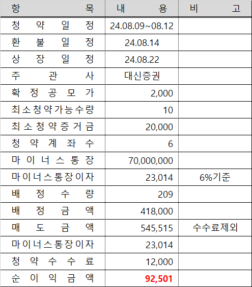 6 계좌를 통한 균등+비례청약으로 총 209주를 배정받아 418,000원으로 9시 시초가 2,620원에 배정받은 209주 전량 매도하여 수수료 제외하고 545,515원을 받았으며 원금과 6 계좌에 대한 수수료 12,000원을 제외해 줍니다.