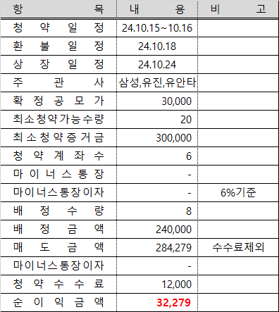 6 계좌를 통한 균등청약으로 총 8주를 배정받아 240,000원으로 9시 시초가 35,600원에 배정받은 8주 전량 매도하여 수수료 제외하고 284,279원을 받았으며 원금과 6 계좌에 대한 수수료 12,000원을 제외해 줍니다.
