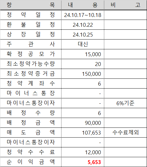 6 계좌를 통한 균등청약으로 총 6주를 배정받아 90,000원으로 9시 시초가 18,010원에 배정받은 6주 전량 매도하여 수수료 제외하고 107,653원을 받았으며 원금과 6 계좌에 대한 수수료 12,000원을 제외해 줍니다.