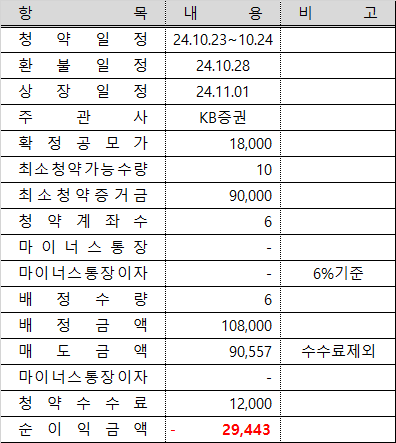 6 계좌를 통한 균등청약으로 총 6주를 배정받아 108,000원으로 9시 시초가 15,120원에 배정받은 6주 전량 매도하여 수수료 제외하고 90,557원을 받았으며 원금과 6 계좌에 대한 수수료 12,000원을 제외해 줍니다.