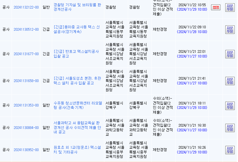 위와 같이 해당조건에 맞는 투찰가능한 공고들이 검색이 되며, 투찰일정이 가능한 공사를 클릭합니다.