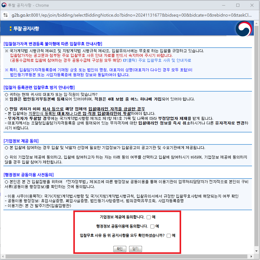 공고문의 우측 상단에 위치한 지문투찰 버튼을 클릭하고 3가지 항목에 동의 후 확인을 클릭합니다.