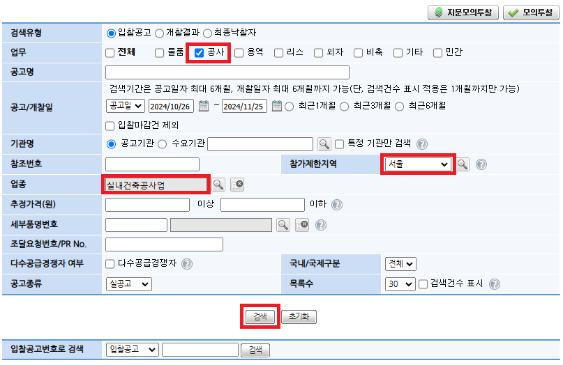 접속 후 상세검색을 클릭하면 위와 같은 화면이 나타나며, 서울지역에서 실내건축공사업의 면허가 필요한 공사를 검색해 줍니다.(해당 면허 및 업종, 지역에 맞춰 검색조건을 반영합니다)
