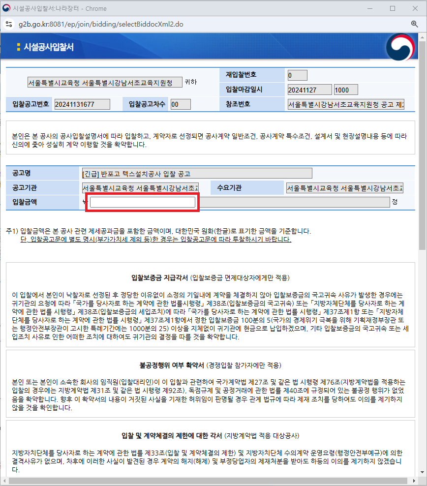 위에서 계산한 입찰금액을 입력하고, 청렴계약서 및 입찰 관련 유의사항들을 숙지하고 이에 동의 여부에 체크 후 입찰서를 송신합니다.