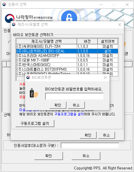나라장터 화면에 접속하여, 인증서 로그인을 클릭 후 바이오보안토큰의 비밀번호를 입력하고 지문인식을 하여 접속합니다.