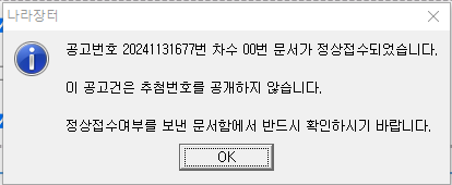 파일을 암호화하는 창이 나타난 후 정상접수되었다는 창이 뜨며 투찰이 정상적으로 완료되었습니다.