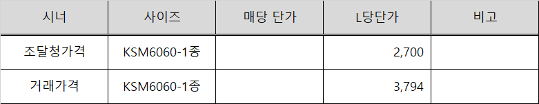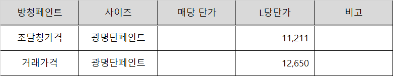 조달에 등록되어 있는 조달단가와 거래가격을 비교하여 주재료인 광명단페인트와 희석재인 시너의 L당 단가를 기준으로 재료비를 작성합니다.