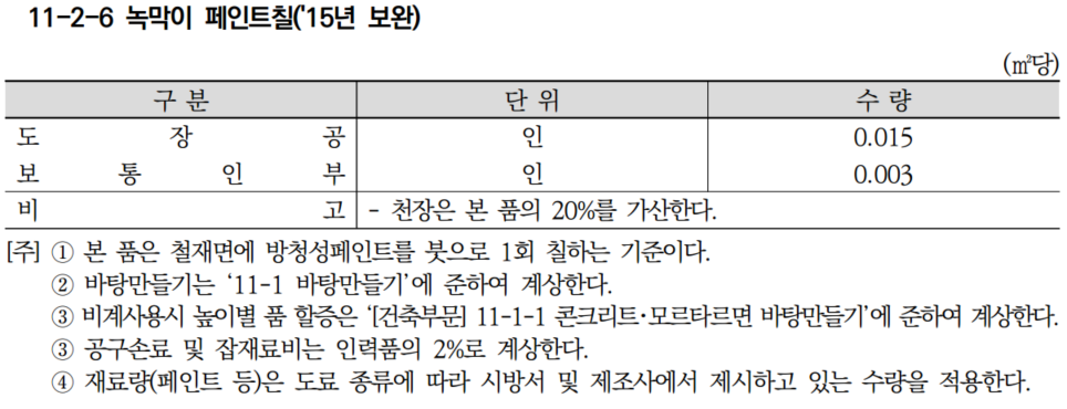 위 품셈은 철재면에 방청성페인트를 붓으로 1회 칠하는 기준으로 1㎡에 도장공 0.015인과 보통인부 0.003인의 인력품이 소요된다는 기준을 제시해 주는 품셈표입니다.