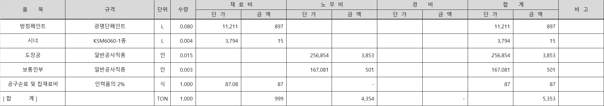 조달에 등록되어 있는 조달단가와 거래가격을 비교하여 주재료인 광명단페인트와 희석재인 시너의 L당 단가를 기준으로 재료비를 작성합니다.