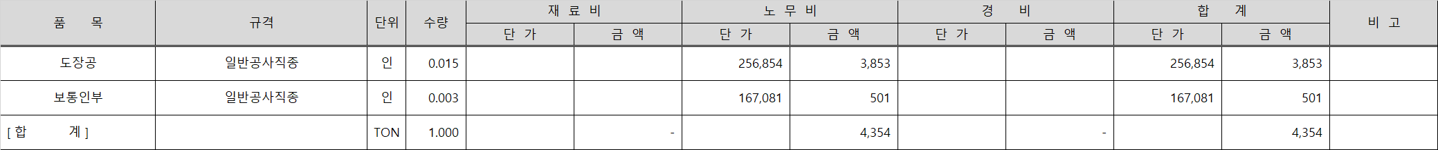 품셈표를 근거로 작성한 노무비 금액을 산출하면 위 표와 같이 녹막이페인트로 1㎡를 붓으로 칠하는데 도장공 0.015인과 보통인부 0.003인이 필요하며, 이들의 인건비의 합은 4,354원입니다.
