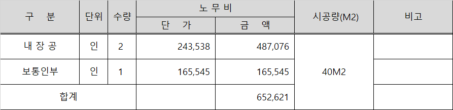 일위대가표를 작성하기 위해서는 1㎡에 대한 인건비가 필요하므로 652,621원의 인건비를 설치할 수 있는 면적 40㎡로 나누면 16,316원이 산출됩니다.