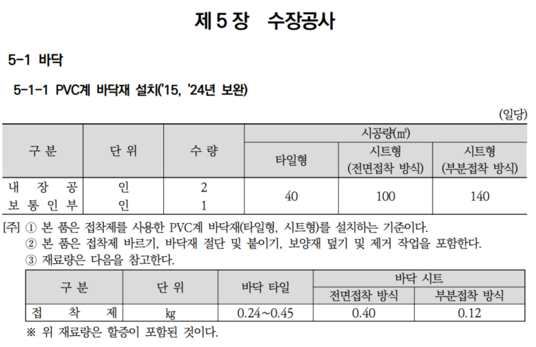 위 품셈은 바닥에 PVC계 바닥재를 설치할 때 1일에 내장공 2인과 보통인부 1인이 타일형을 설치할 경우 40㎡의 면적을 설치할 수 있다는 기준을 제시해 주는 품셈표입니다.
