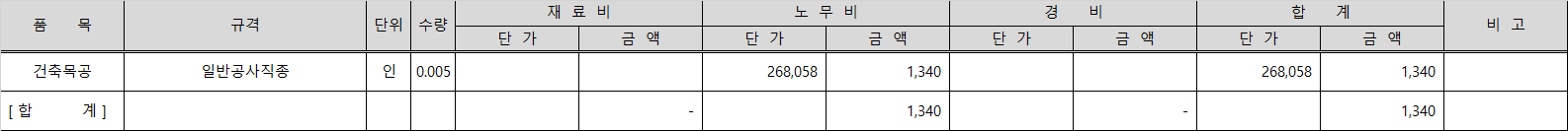 위에서 산출된 먹매김 노무비를 대입하여 일위대가 표를 작성합니다.
