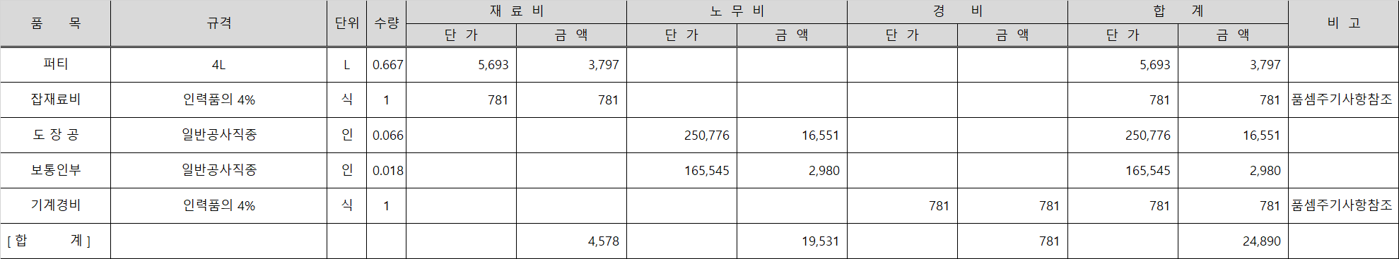 퍼티의 경우 재료량이 별도로 정해져 있지 않고, 종류에 따라 시방서 및 제조사에서 제시하고 있는 수량을 적용하게 되어있어 0.667L를 반영하면 퍼티 1㎡에 소요되는 자재비는 3,797원이 산출됩니다.