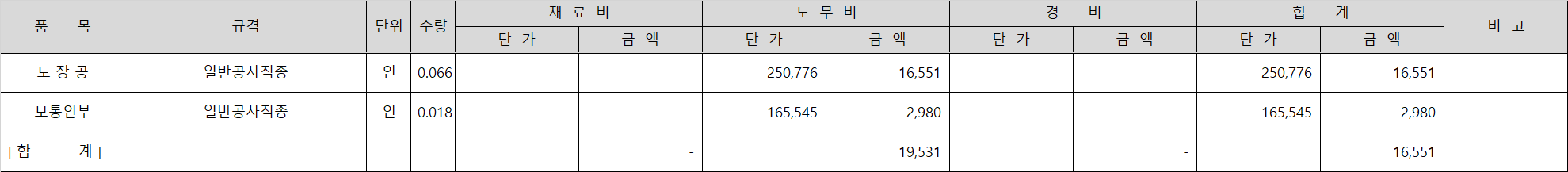 품셈표를 근거로 작성한 노무비 금액을 산출하면 위 표와 같이 1㎡의 석고보드면 바탕 만들기의 올퍼티 기준 도장공 0.066인과 보통인부 0.018인이 필요하며, 이들의 인건비의 합은 19,531원입니다.