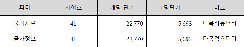 한국물가협회와 같은 정부에서 허가한 전문가격조사기관에서 찾아볼 수 있는 퍼티의 L당 단가를 기준으로 재료비를 작성합니다.