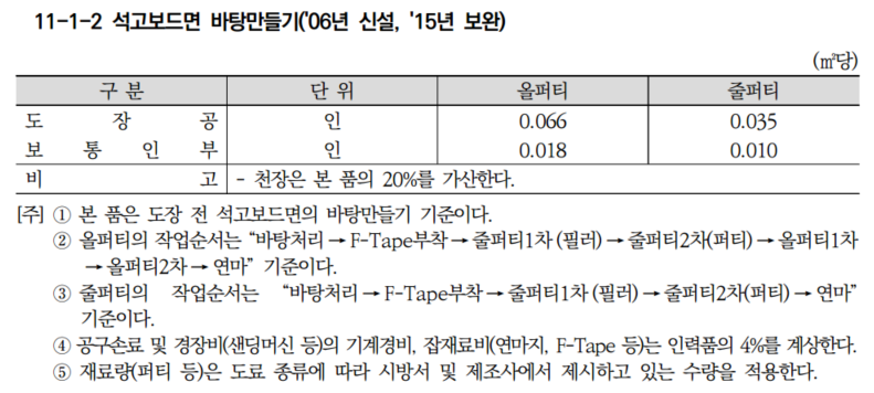 석고보드면 바탕 만들기 노무비 산출 기준