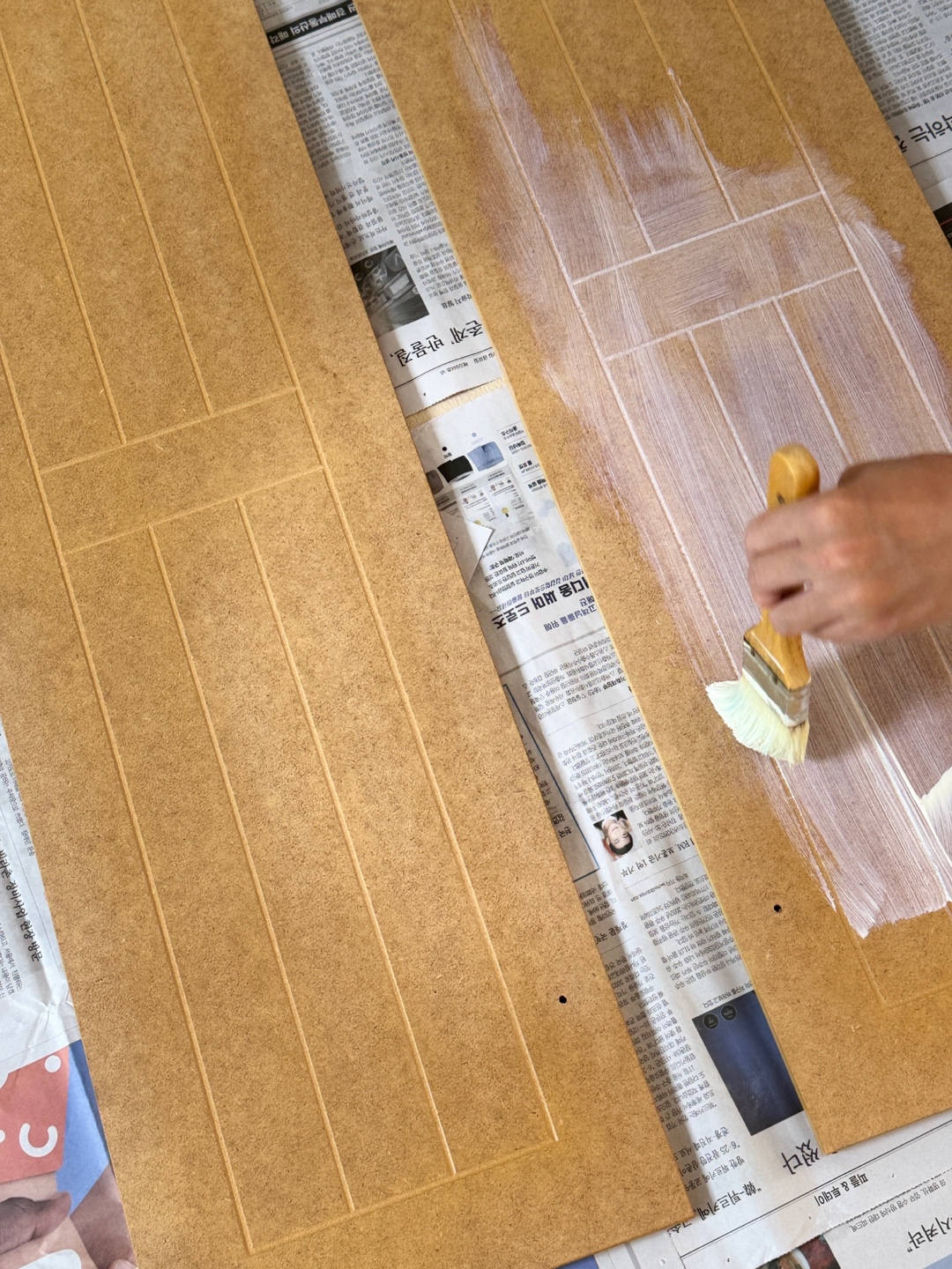 1. 문짝을 전동드릴로 나사를 풀러 해체 후 미관을 해치는 시트지를 제거 후 프라이머를 꼼꼼히 얇게 펼쳐 바릅니다.