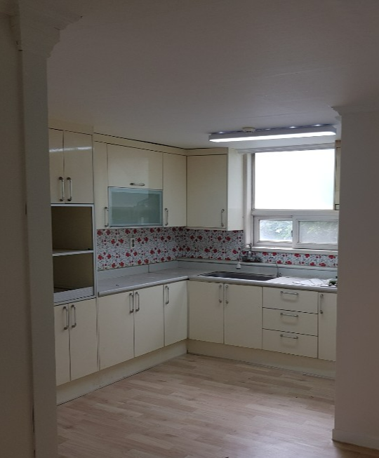 위와 같은 작업을 반복하면 싱크대 리폼도 가능합니다. 아래 사진은 전세집 처음 이사 왔을 당시 장미 타일 + 색이 바랜 싱크대를 페인트와 시트지로 리폼한 사진이며 재료비 10만 원 초반? 발생했던 걸로 기억합니다. 시간적 여유가 되시는 분은 자의든 타의든 한번 시도해 보시기 바랍니다.