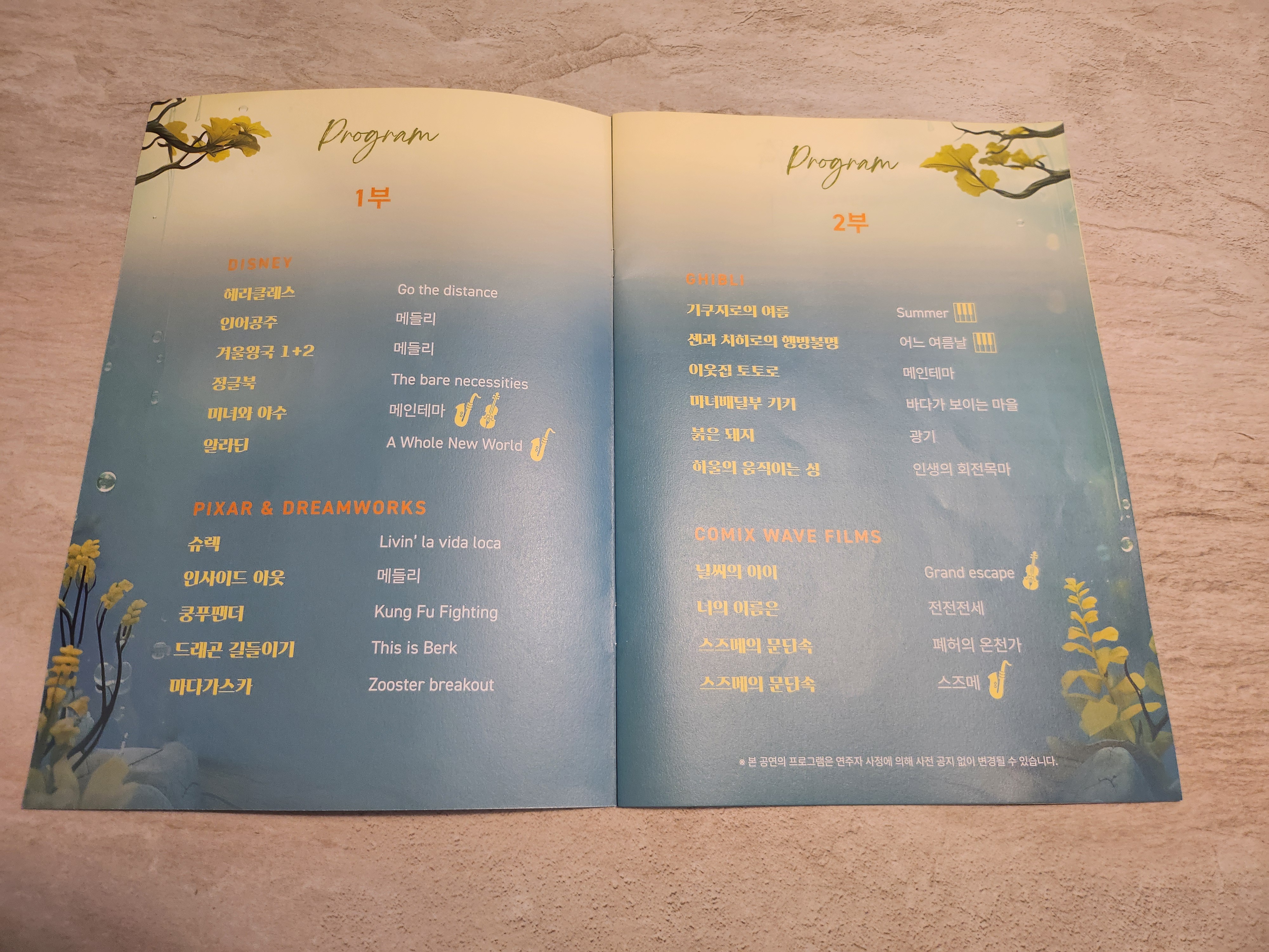 인어공주와 겨울왕국, 기쿠지로의 여름, 스즈메의 문단속등 아이들 있는 부모라면 누구나 알법한 곡들이 주를 이뤘으며 예매할 때부터 좋은 자리는 이미 많이 매진된 상태였기에 인기는 사전에 충분히 예상했었습니다.