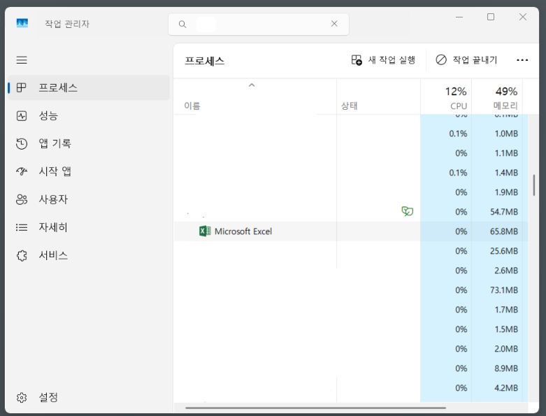 단축키 Ctrl + shift + esc를 사용하여 작업관리자 창을 열어줍니다. 아래 그림의 엑셀을 우클릭하여 작업종료 시켜준 후 열리지 않던 엑셀파일을 다시 실행시켜 줍니다.