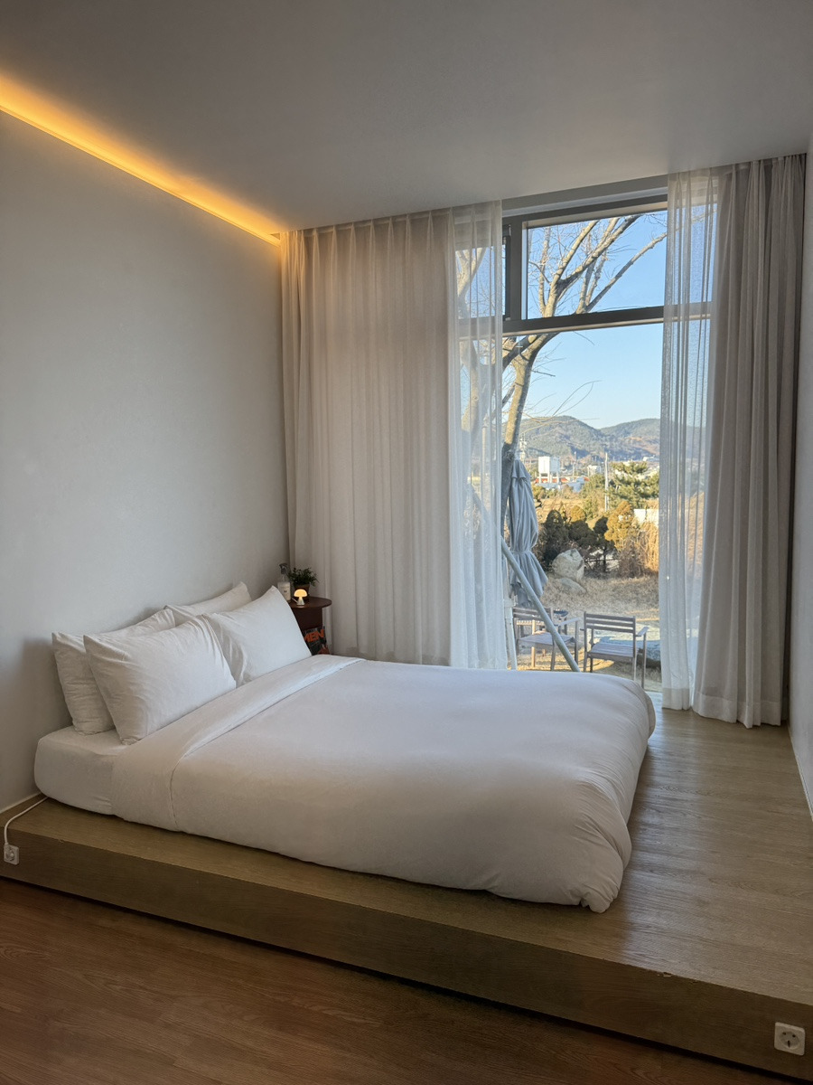 안동 하회마을에서 출발해 1시간 반정도 거리에 위치한 와이프가 주방에 사각창문으로 보이는 뷰에 반해 고른 숙소 "해온안"입니다. A동과 B동으로 이루어져 있으며, 저희는 좀 더 크고, 화장실 2개, 편하게 이용하기 위해 A동으로 선택했습니다.