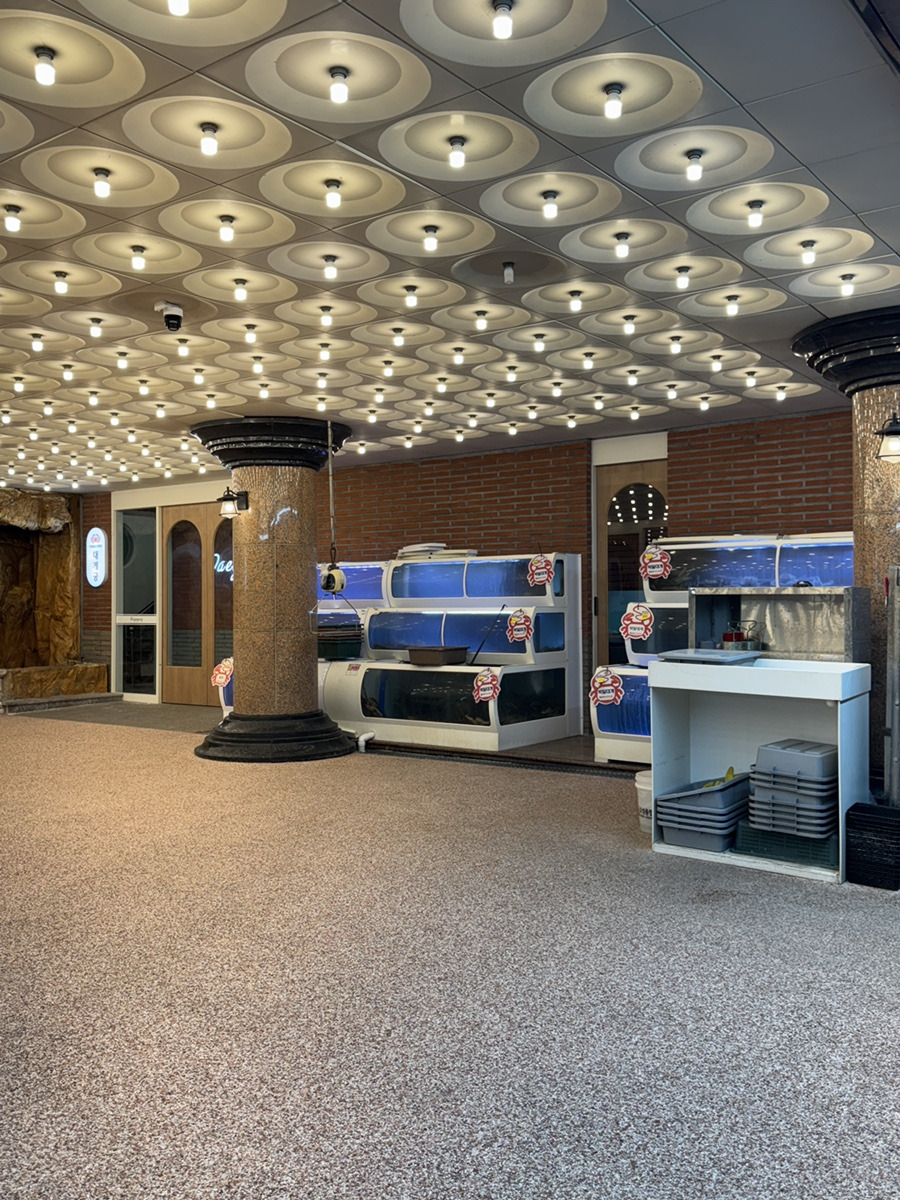 인테리어에 돈을 엄청 쏟은듯한 느낌의 대게식당으로 입장. 1층 필로티에 보면 저런 식으로 대게가 가격표를 붙이고 기다리고 있습니다. 아주머니(사장님) 한분 계시며, 주문을 받으십니다.