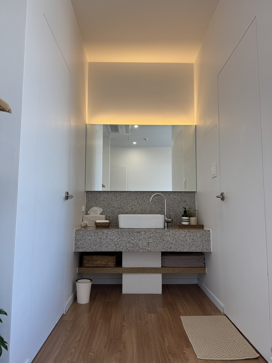 방 1과 방 2, 방과 방 사이에 세면대가 위치하며, 안방에는 욕조 있는 화장실이 딸려있습니다.