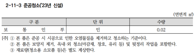 위 품셈은 바닥면적단위 1㎡당 준공청소를 진행하는데 필요한 보통인부의 품수의 기준을 제시해 주는 품셈표입니다.