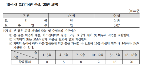 반대로 외벽 패널의 이음매를 메꾸기 위하여 코킹이 필요한 경우에는 아래의 건축품셈 10장 창호 및 유리공사 10-4-3 코킹 품을 활용하여 일위대가를 만들어 반영할 수 있습니다.