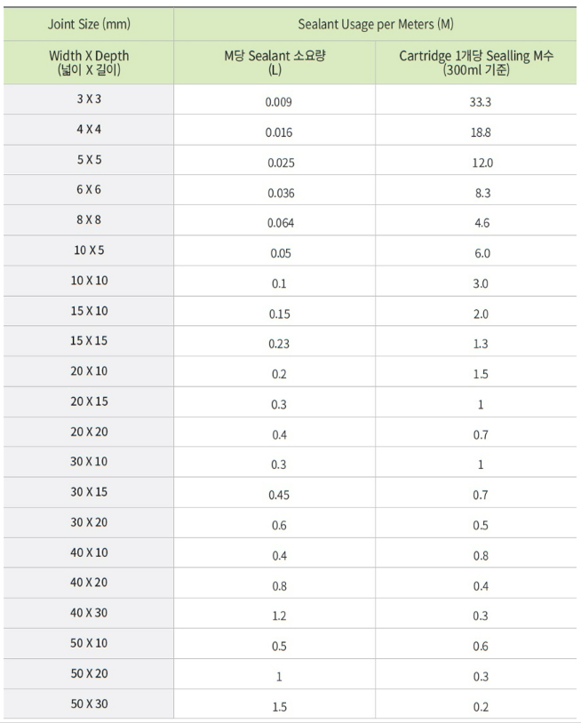 재료량은 실리콘 카트리지 1개당 300ml 들어있으며 코킹의 단면적의 크기에 따라 소요되는 량이 다르기 때문에 별도 크기별로 제조사에서는 소요량을 안내해주고 있으며 이에 따라 적용토록 합니다.