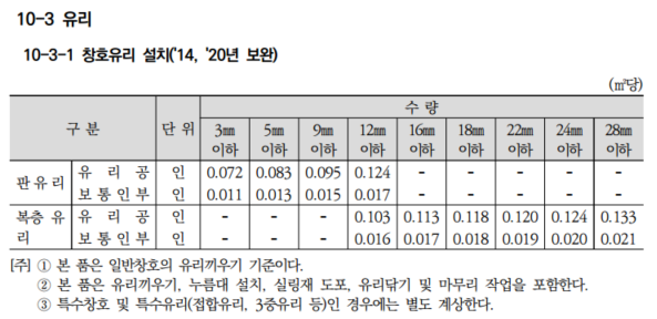 인테리어 내역을 작성하다 보면 강화유리를 자주 사용하게 되며, 위에 설명드린 창호유리설치 품셈을 참고하여 일위대가 작성을 합니다. 주기사항에 나와있듯이 실링재도포에 대한 인건비는 창호유리 설치 품셈에 포함이 되어 있기 때문에, 실리콘 재료비를 누락하지 말고 추가로 반영하여 주시기 바랍니다.
