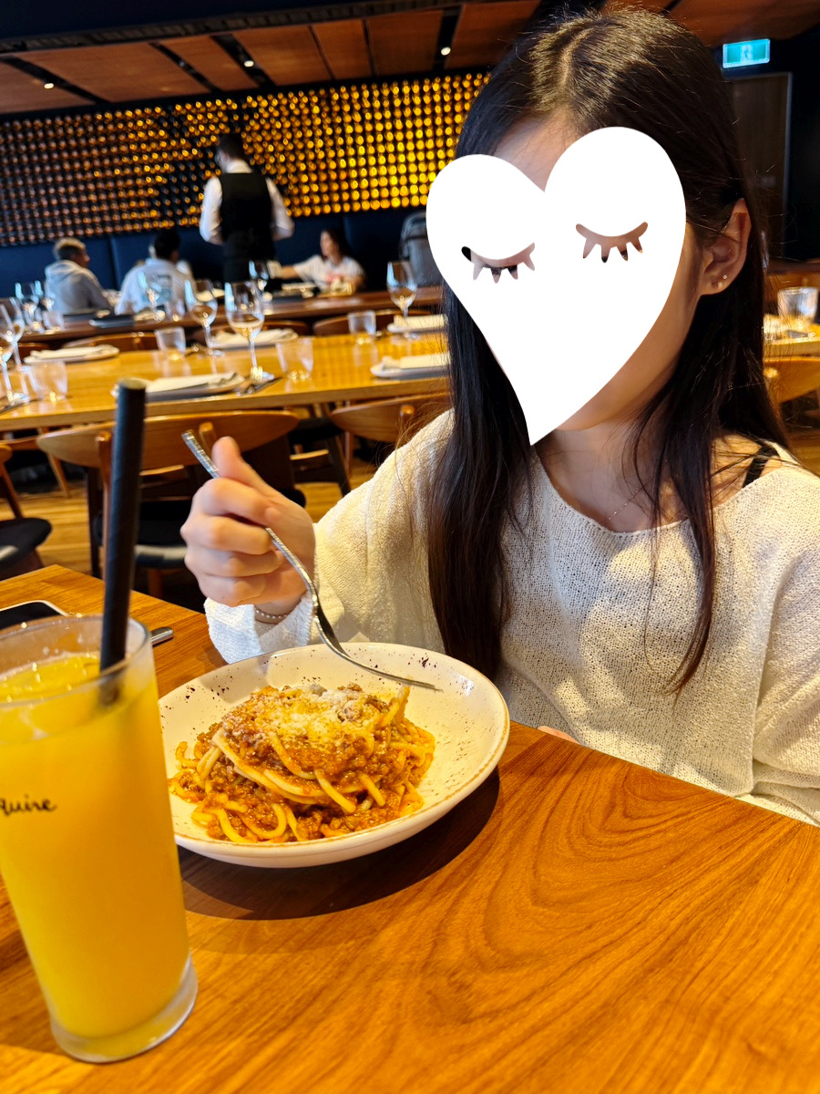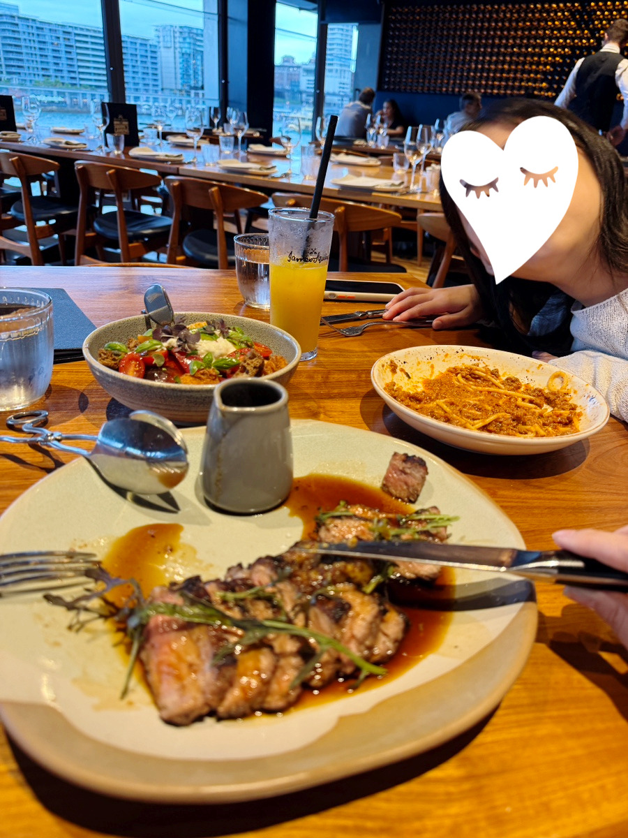 딸은 어린이 메뉴로 스파게티랑 주스를 주문! 저는 스테이크랑 샐러드 주문+화이트 와인!!! 너무 신나요:)
