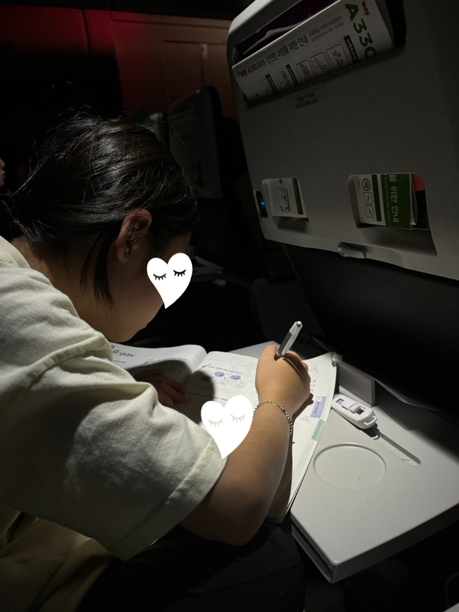숙제 계속 미루더니 비행기 타고 숙제하는 딸아이의 모습입니다. ㅎㅎ