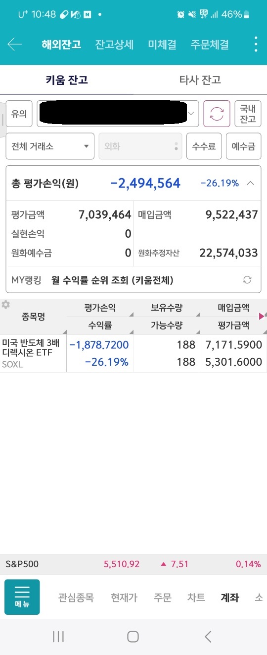 글을 쓰는 현재 -5%를 넘어가고 있으며 지속적인 하락으로 매수가 이루어져 188주 보유하고 있으며,  계좌는 -26%대를 보여주고 있습니다.